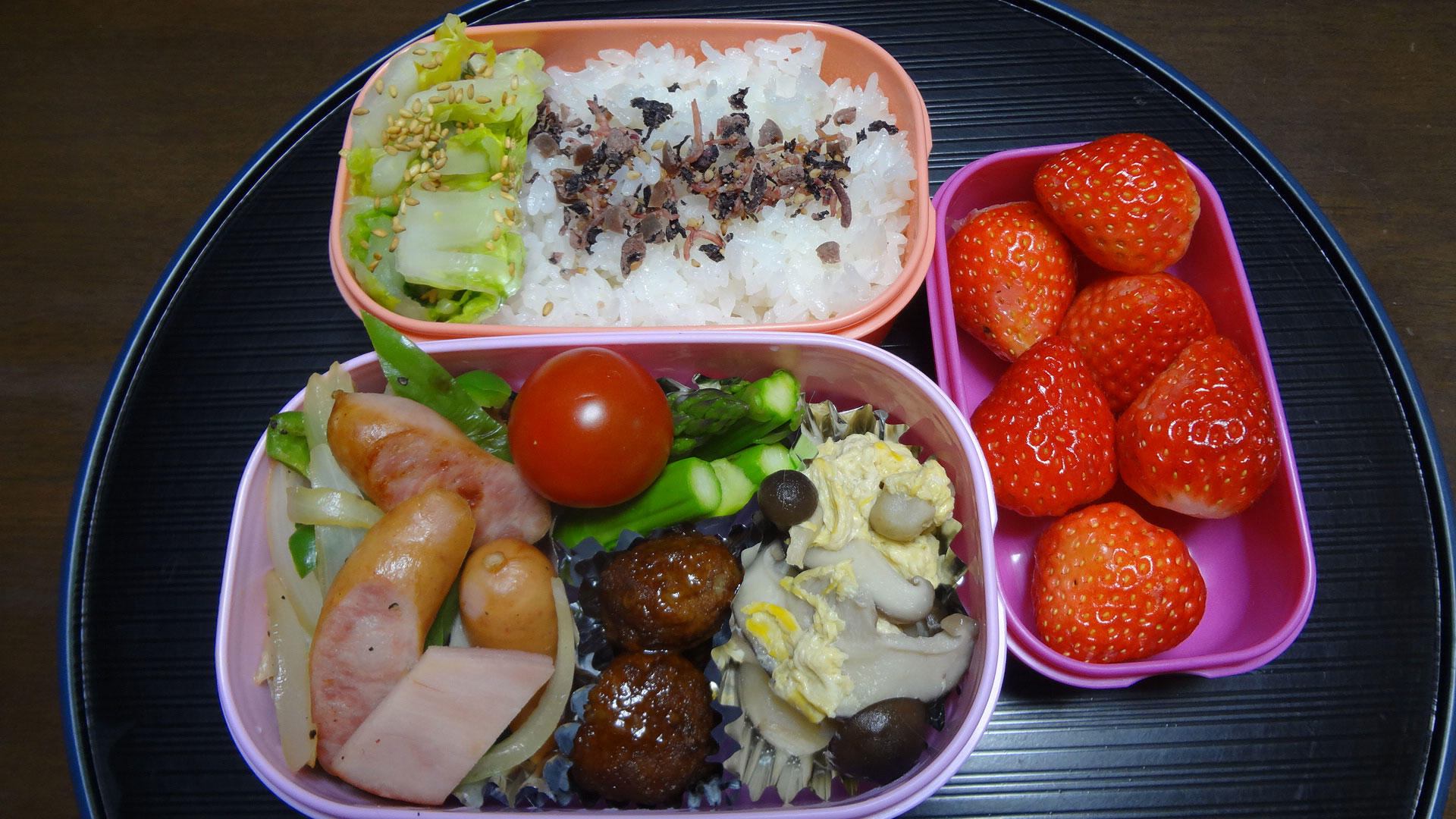 今日のお弁当 エノキと椎茸の卵とじ 肉団子 アスパラとトマト 野菜とソーセージのソテー 梅ジャコふりかけ 白菜の浅漬け 苺 でした。